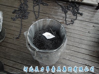 圖為包裝中的辰力起重鏈條,鏈條上方的白色包裝袋內(nèi)為干燥劑。辰力起重鏈條的包裝一般有鐵桶(如圖)、編織袋。對外出口的貨物除了外面這層塑料袋,還需要添加干燥劑以保證內(nèi)部的干燥,防止鏈條生銹。